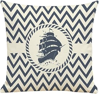 BIGBOBA - Housse de coussin en lin - Motif : bateau pirate et vagues - Douce - Bleu/blanc - 45 x 45 cm