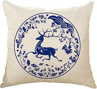 BIGBOBA Housse de coussin en lin bleu et blanc - Motif porcelaine - 45 x 45 cm