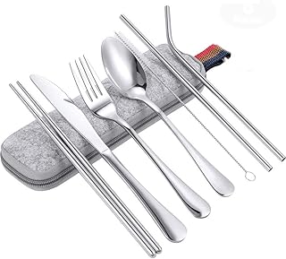 Elegant Life Couverts de Camping 8 pièces, Acier Inoxydable,Couverts de Voyage extérieurs éutilisables accompagnés de 2 cuillères,Couteau, Fourchette,2 pailles,Baguettes, Brosse de Nettoyage