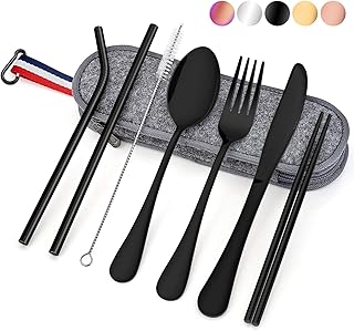 E-far Lot de 8 couverts de voyage réutilisables en acier inoxydable avec étui - Comprend un couteau, une fourchette, une cuillère, des baguettes, des pailles, une brosse de nettoyage (noir)